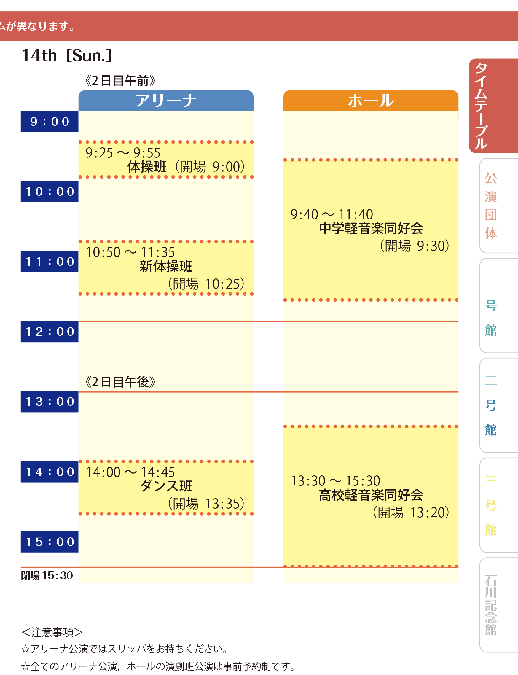 2日目 午後の部13:00-15:30 (15:00受付終了)- アリーナ公演を観覧される方はスリッパや上履きをご持参ください。