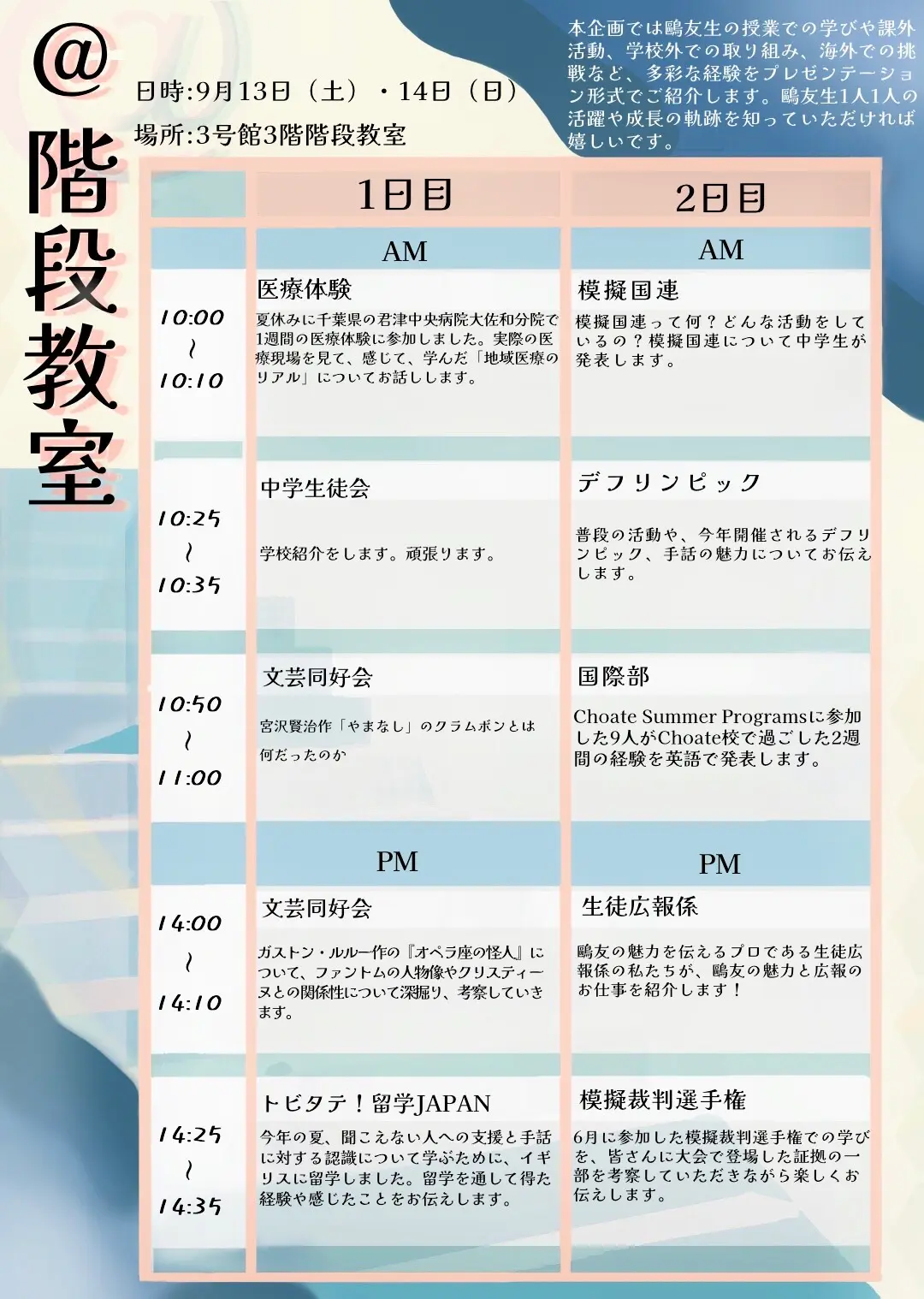 - アリーナ公演・ホール公演・「@階段教室(階段教室での発表会)」のタイムスケジュールなど詳細については別途掲載している「タイムテーブル」で確認することができます。