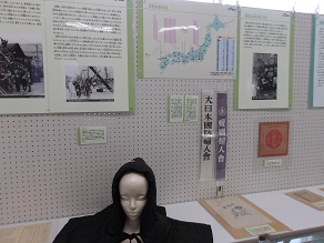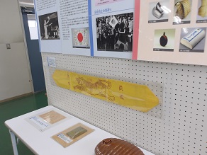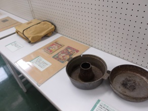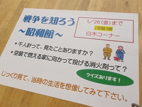 現在は2号館3階の白木で、昭和館からお借りした「戦争を知ろう」の展示をおこなっています。こちらも実物が多くあり、千人針や当時の調理器具など言葉は知っているけれどあまり見る機会がなかったものを見たり、クイズに答えることでより深く学べたりする展示になっています。26日までの予定です。