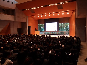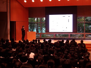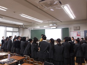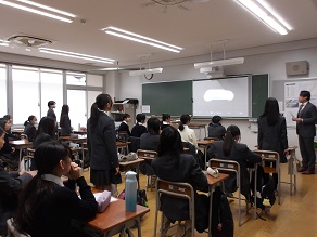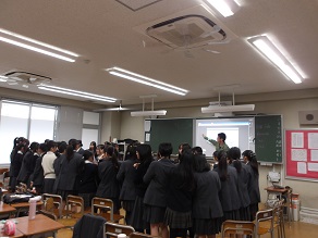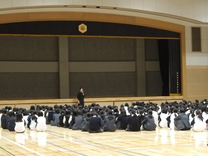 高校2年生はホールで修学旅行に向けた社会科の先生からのお話を聞いていました。京都・奈良は社会科で学んできたことを実際に体験できることが多い場所です。