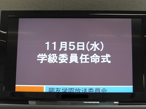 今日は朝、学級委員任命式のテレビ放送がありました。校長先生からⅡ期の学級委員への激励と、クラスをよりよくしていくためには全員の協力が必要、というお話がありました。その後クラス内で担任の先生が選挙で選ばれた学級委員を呼名し、任命しました。