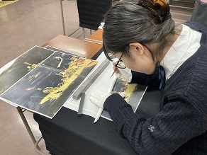 顔料やニカワの実物も見せて頂き、日本画の技法を伺ったあと、先生の実演に続き、生徒たちも「上げ写し」に挑戦。