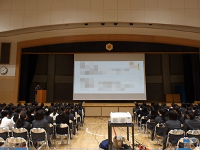 中学3年生は教室でのホームルームのあとホールで合同ホームルームでした。最初に教頭先生から高校進学に向けたお話があり、熱心に聞く姿が見られました。