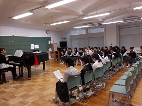 8組は音楽。音楽室でまずは校歌を練習していました。