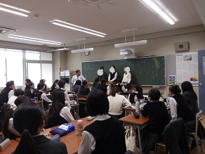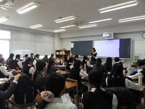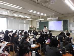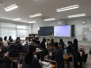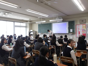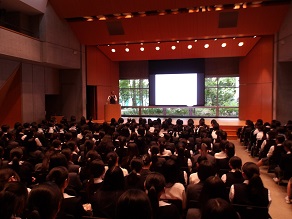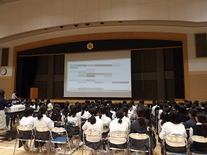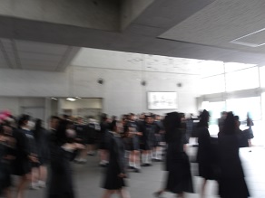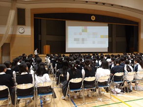 高校1年生はホールで合同ホームルームでした。教頭先生から進路に関するお話を聞きました。